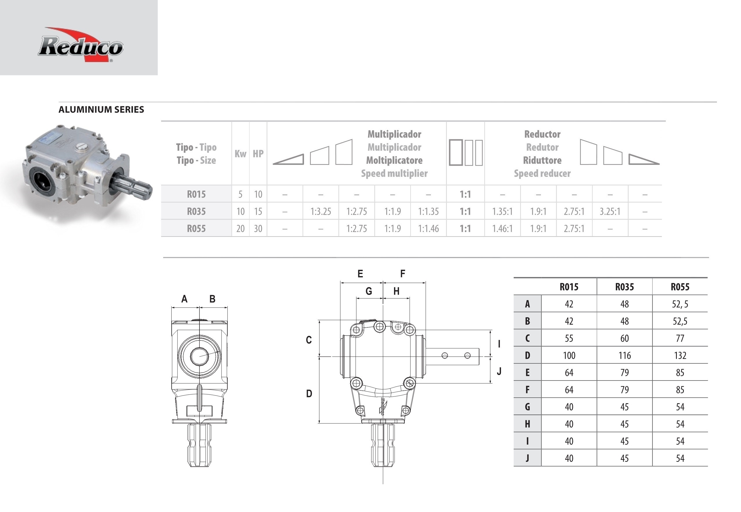 La Serie Aluminio de Reduco ofrece tres tamaños para aplicaciones desde 10 CV hasta 30 CV. Se puede suministrar en versión Multiplicadora o versión Reductora con tres configuraciones estándares de rotación.