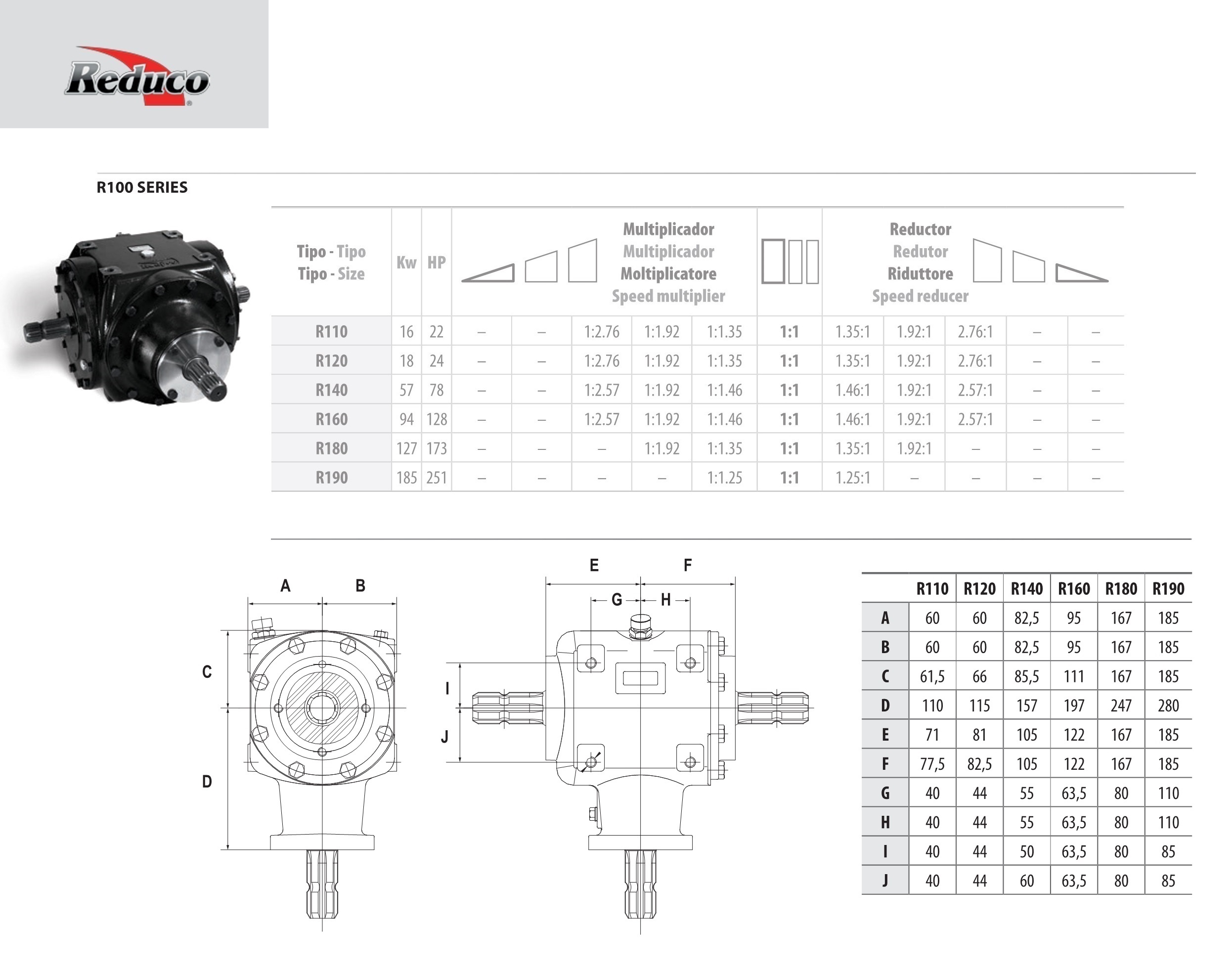 La Serie R 100 de Reduco ofrece seis tamaños para aplicaciones desde 22 CV hasta 251 CV. Se puede suministrar en versión Multiplicadora o versión Reductora con tres configuraciones estándares de rotación.