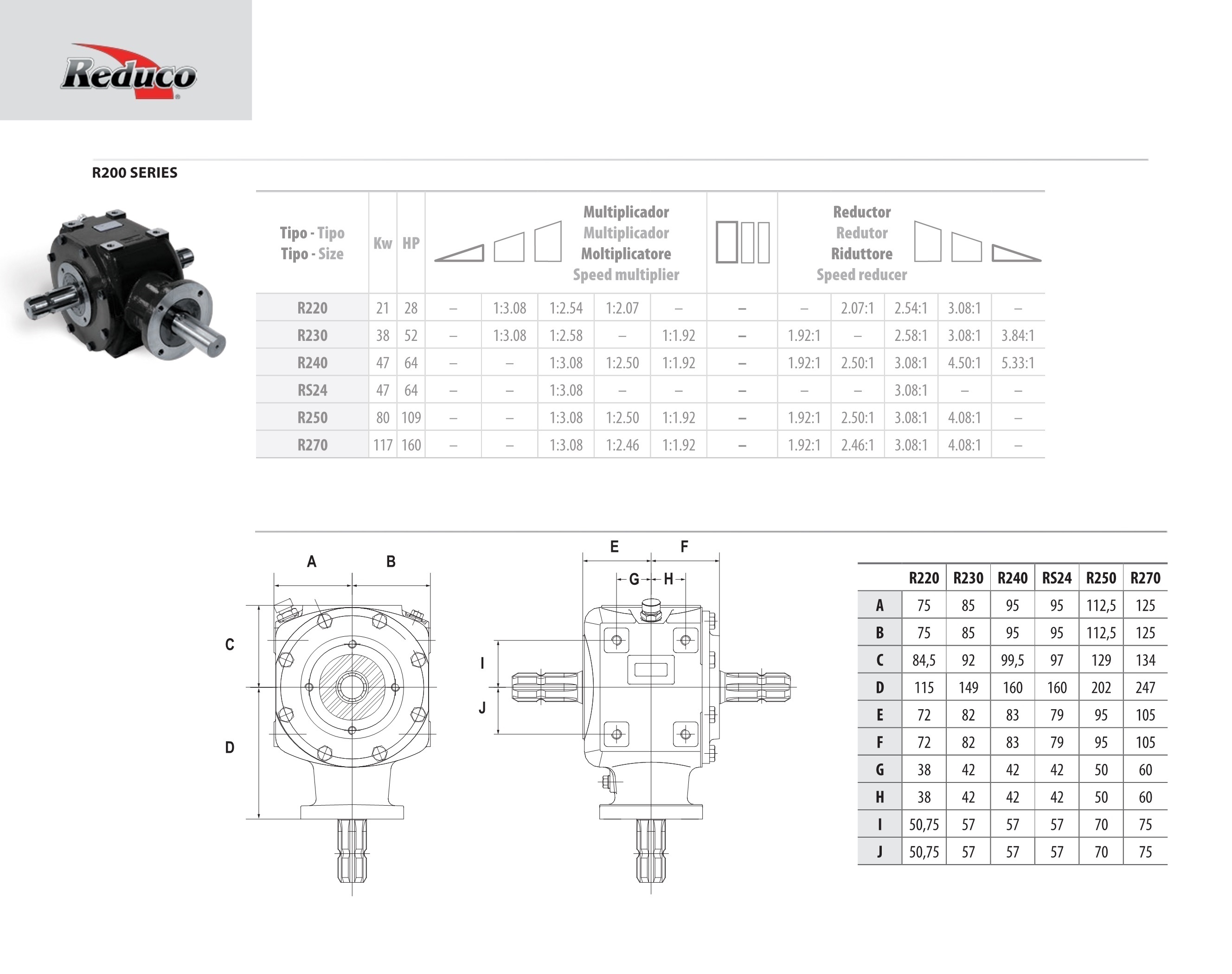 La Serie R 200 de Reduco ofrece seis tamaños para aplicaciones de alto rendimiento desde 28 CV hasta 160 CV. Se puede suministrar en versión Multiplicadora o versión Reductora con tres configuraciones estándares de rotación.
